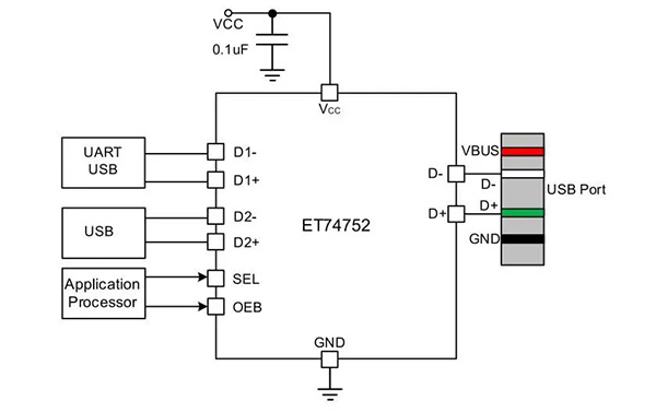 ET74752是力芯微推出的高性能DPDT USB 2.0開關(guān)芯片,集成過壓保護(hù)(OVP)和浪涌防護(hù)功能,專為智能設(shè)備接口安全設(shè)計(jì)。支持480Mbps高速傳輸,帶寬達(dá)1GHz(單端)。其核心優(yōu)勢在于多重保護(hù)機(jī)制:當(dāng)檢測到D+/D-引腳電壓超過5.1V時(shí),OVP功能自動切斷通路,可耐受24V DC輸入;同時(shí)支持35V浪涌防護(hù),有效保護(hù)下游電路。