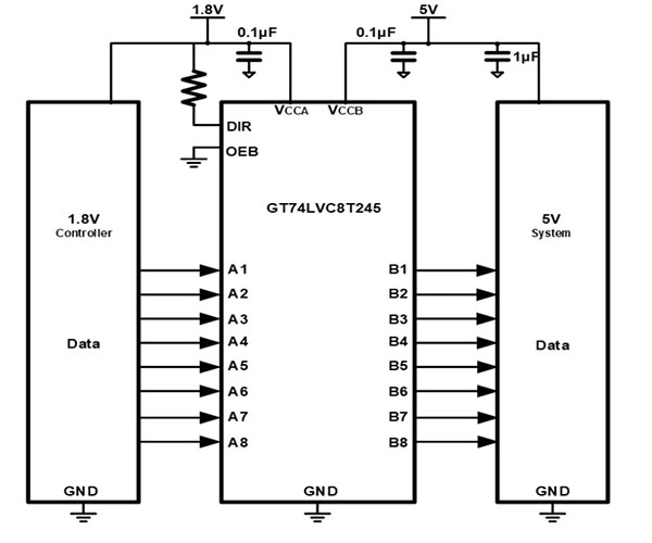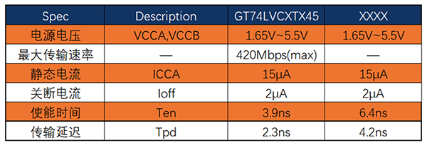 GT74LVCXTX45系列包括一路,二路,四路,八路和十六路收發(fā)器,是具有可配置電平轉換的雙電源總線收發(fā)器。最大傳輸速率可達到420Mbps,滿足高速數(shù)據傳輸要求。該收發(fā)器使用兩個獨立的電源軌,VCCA和VCCB的工作電壓范圍為1.65V至5.5V,支持寬電壓輸入。A端口參考VCCA,B端口參考VCCB,可以在1.8V、2.5V、3.3V和5.5V電壓節(jié)點之間實現(xiàn)通用低壓雙向轉換。具備VCC隔離特性,當任一VCC輸入端處于接地狀態(tài),則所有輸入端均處于高阻抗狀態(tài)。A端口和B端口的輸入電路始終處于激活狀態(tài),并具有邏輯高電平或邏輯低電平,以防止出現(xiàn)過多的ICC和ICCZ。GT74LVCXTX45的控制引腳由VCCA供電。該芯片的工作范圍為-40℃~125℃。