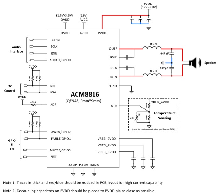 ACM8816是一款集成GaN HEMT的器件,高效、高性能具有數(shù)字輸入的單聲道D類音頻放大器。外圍應(yīng)用電路只需要很少的無(wú)源元件,能在4.5V至50V的PVDD和AVCC電源、3.3V或1.8V的DVDD電源下工作。ACM8816集成了7mΩRdson-GaN-HEMT,驅(qū)動(dòng)到4Ω可以在10%THD+N內(nèi)輸出1×340W的功率,而不需要散熱器。