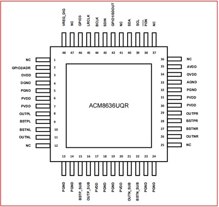 ACM8636一款2.1通道數(shù)字輸入音頻功率放大器。供電電壓范圍在 4.5V-26.4V。在2.1通道工作模式, 2 x 8 歐+4 歐負(fù)載下,輸出功率可以達(dá)到2×30W+60W ; THD+N不超過(guò)1%。