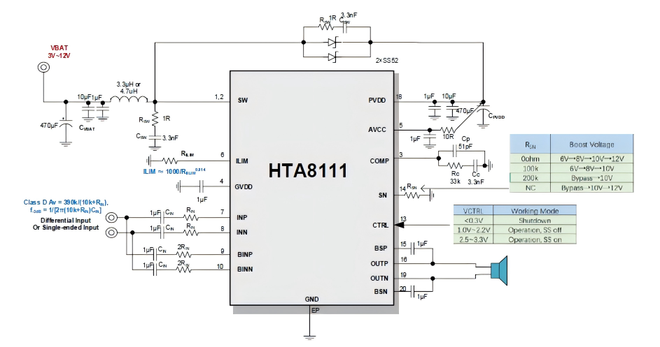 HTA8111內(nèi)置可動(dòng)態(tài)調(diào)節(jié)的升壓,可提供一個(gè)適應(yīng)不同輸出功率的電壓給D類功放,可大幅提高系統(tǒng)效率,延長(zhǎng)電池續(xù)航時(shí)間。還可配置升壓限流值,以防止過(guò)大的電流尖峰。