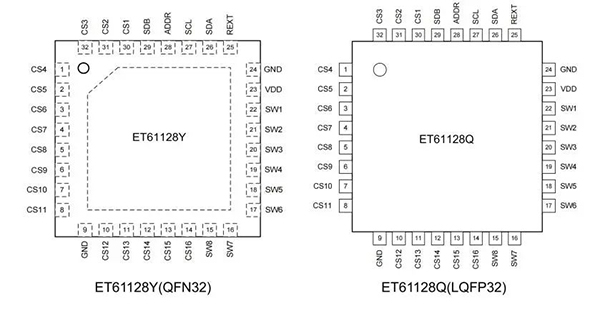 ET61128采用標(biāo)準(zhǔn)I²C接口,支持400KHz高速通訊,具備連續(xù)讀寫功能,4個(gè)片地址可選,方便多設(shè)備協(xié)同工作。芯片內(nèi)部集成開短路檢測(cè)、軟硬件關(guān)斷、擴(kuò)頻及消隱功能,確保系統(tǒng)穩(wěn)定運(yùn)行,延長LED壽命。靜態(tài)電流低至3mA,關(guān)斷模式功耗僅3uA,延長電池設(shè)備續(xù)航。封裝采用QFN32(4mm×4mm)和LQFP32(7mm×7mm),可適應(yīng)不同空間需求。