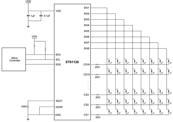 ET61128的工作電壓為2.7~5.5V,最大支持16×8陣列顯示,可驅(qū)動(dòng)128個(gè)LED,16路恒流輸出,電流最大達(dá)49.2mA,通過外接電阻可以靈活調(diào)節(jié)輸出電流。芯片支持全局32檔電流調(diào)節(jié),以及每通道4檔獨(dú)立微調(diào),能夠精準(zhǔn)匹配多樣LED負(fù)載。每點(diǎn)還支持256級(jí)PWM精細(xì)調(diào)光,實(shí)現(xiàn)平滑漸變與動(dòng)態(tài)效果,提升用戶體驗(yàn),滿足多樣化亮度需求。