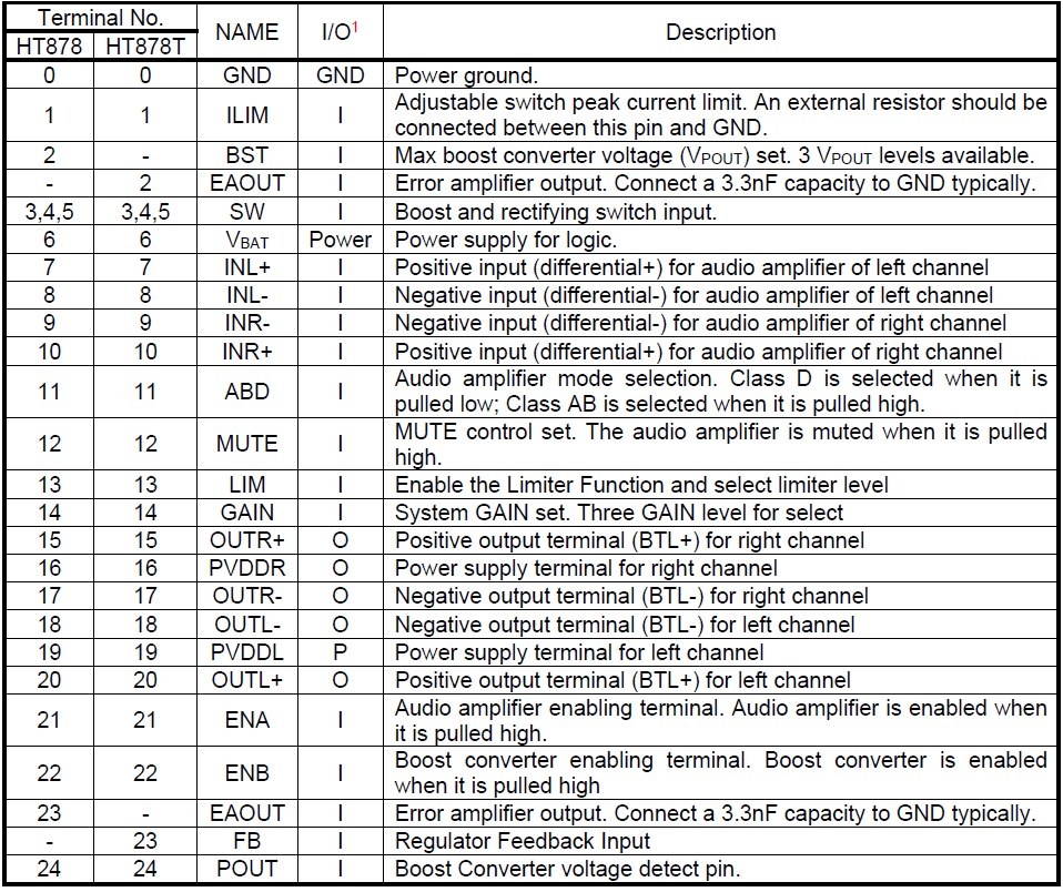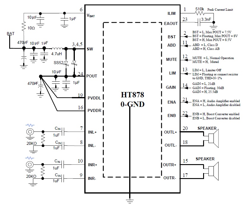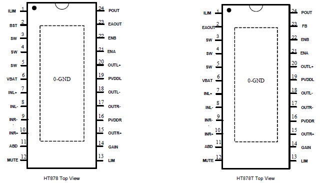 當前位置:首頁->產(chǎn)品展示->功放IC->HT878/HT878T(可任意限幅、單節(jié)鋰電池內(nèi)置自適應升壓8W雙聲道音頻功放IC) |