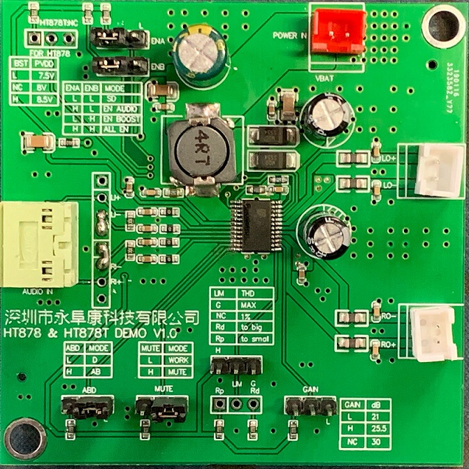 此外,HT878內(nèi)部集成免濾波器調(diào)制技術(shù),能夠直接驅(qū)動揚聲器,內(nèi)置的關斷功能使待機電流最小化,還集成了輸出端過流保護、片內(nèi)過溫保護和電源欠壓異常保護等功能。