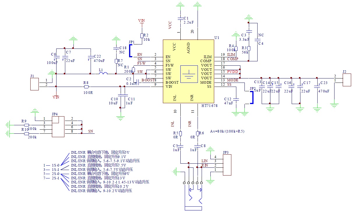 HT71678帶有音頻信號(hào)檢測功能,可根據(jù)信號(hào)幅度自適應(yīng)調(diào)整升壓輸出值,以達(dá)到更高的系統(tǒng)整體效率。其支持10種不同的模式選擇。