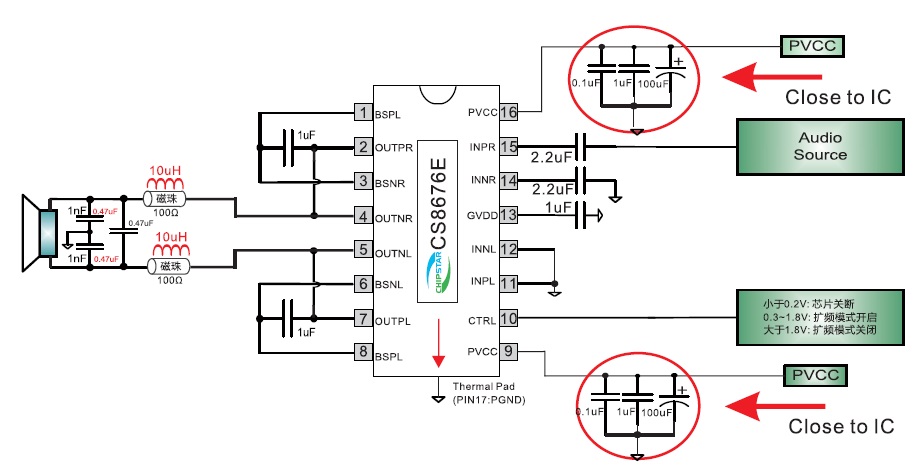 當(dāng)前位置:首頁(yè)->產(chǎn)品展示->功放IC->CS8676(擴(kuò)頻功能、低空載電流、免輸出電感、2X20W雙聲道/40W單聲道D類音頻功放IC) |