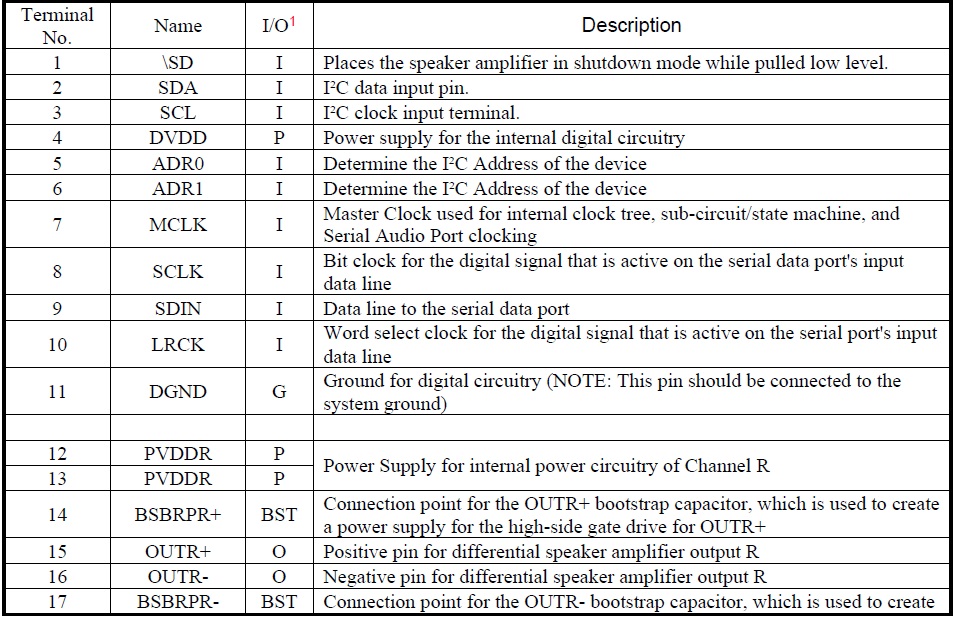 2×14W, 立體聲輸出(4Ω, 12V, THD+N = 1%); 2×10.5W, 立體聲輸出 (6Ω, 12V, THD+N = 1%) |