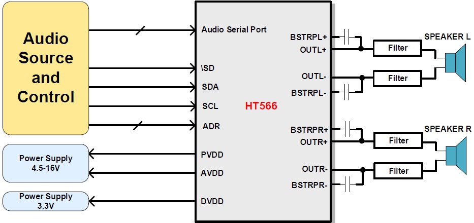 The HT566 is a stereo Class D audio amplifier with multiple audio format port (I2S, LJ, RJ, TDM). It supports a variety of audio clock configurations. The outputs of the HT566 can be configured to drive two speakers in stereo BTL mode or mono PBTL mode.