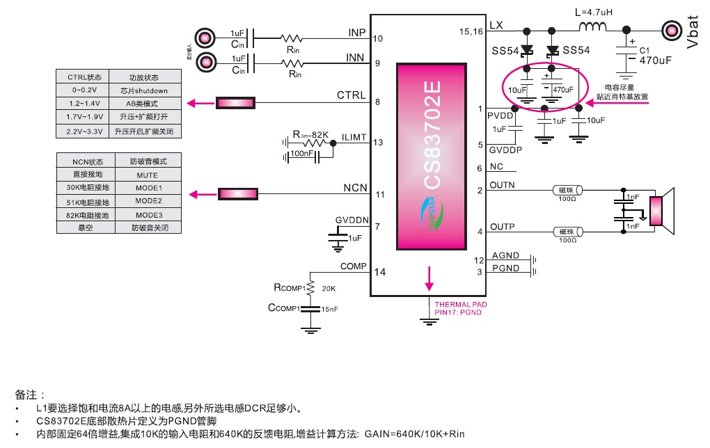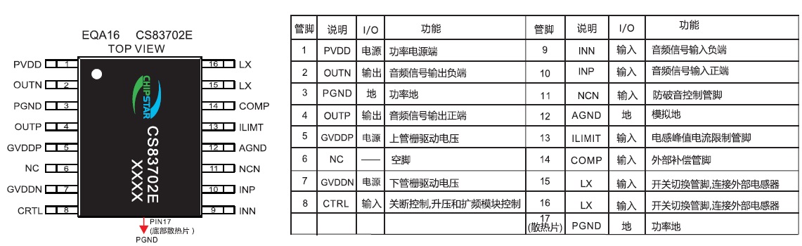CS83702(單節(jié)鋰電池3.7V供電內(nèi)置升壓18W單聲道D類(lèi)音頻功放IC) |