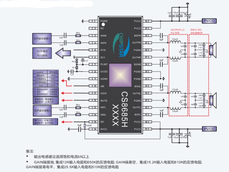 CS8685H提供了特殊的EQB32封裝形式供客戶選擇,合適的封裝尺寸為客戶安裝散熱器件提供了最大的方便,其額定的工作溫度范圍為-40℃至85℃。