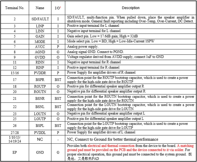 內(nèi)置DSP音效處理算法、2×14W立體聲/ 1×23W單聲道、數(shù)字輸入D類音頻功放IC |
