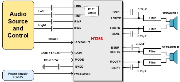 HT366是一款高效D類音頻功率放大器。 在14V供電的立體聲(BTL)模式、THD+N=10% 條件下,能夠持續(xù)提供2*20W/4Ω功率輸出;在單聲道(PBTL)、模式、THD+N=10%條件下,能夠持續(xù)提供34W/4Ω功率輸出。