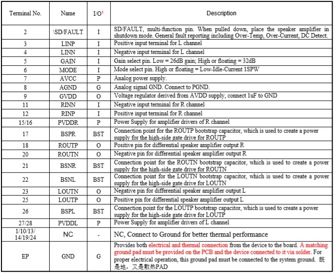 2×50W,立體聲模式(4Ω, 24V, THD+N = 1%);100W,1×100W單聲道模式(2Ω, 24V, THD+N = 1%)
